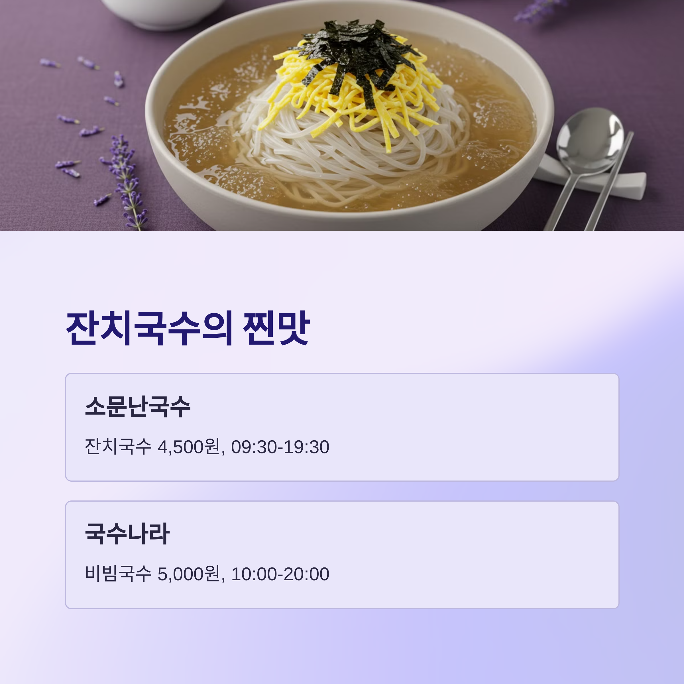 날씨가 흐리거나 기분이 축축 처지는 날엔, 따끈한 잔치국수 한 그릇 생각나지 않으세요? 광명엔 그런 날 딱 맞는 국수집이 있어요. 멸치 육수에 삶은 소면, 얇게 채 썬 계란지단과 김가루, 그리고 살짝 매콤한 양념장이 어우러진 국수 한 그릇은 정말 위로가 되거든요. 특히 어르신들이 많이 찾는 오래된 국수집은 기교보다는 정성이 느껴져서 더 좋습니다.